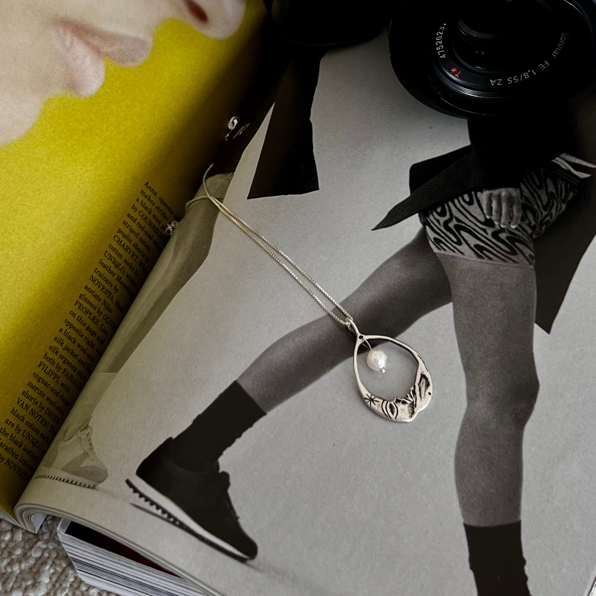 שרשרת עם תליון ירח בשילוב פנינה, כל תליון מעט מושחר ומיוצר בעבודת יד, מה שהופך כל פריט לייחודי ואישי.