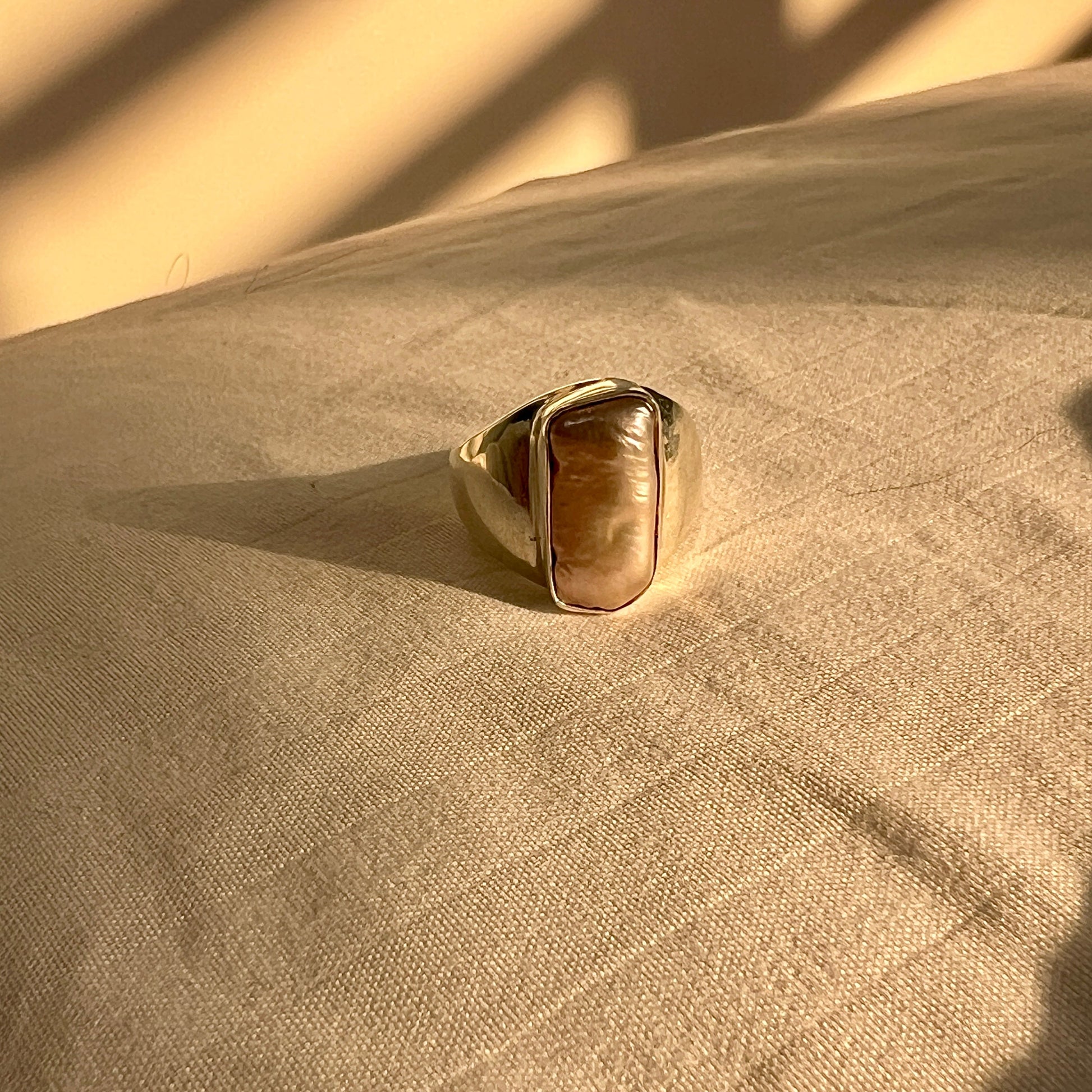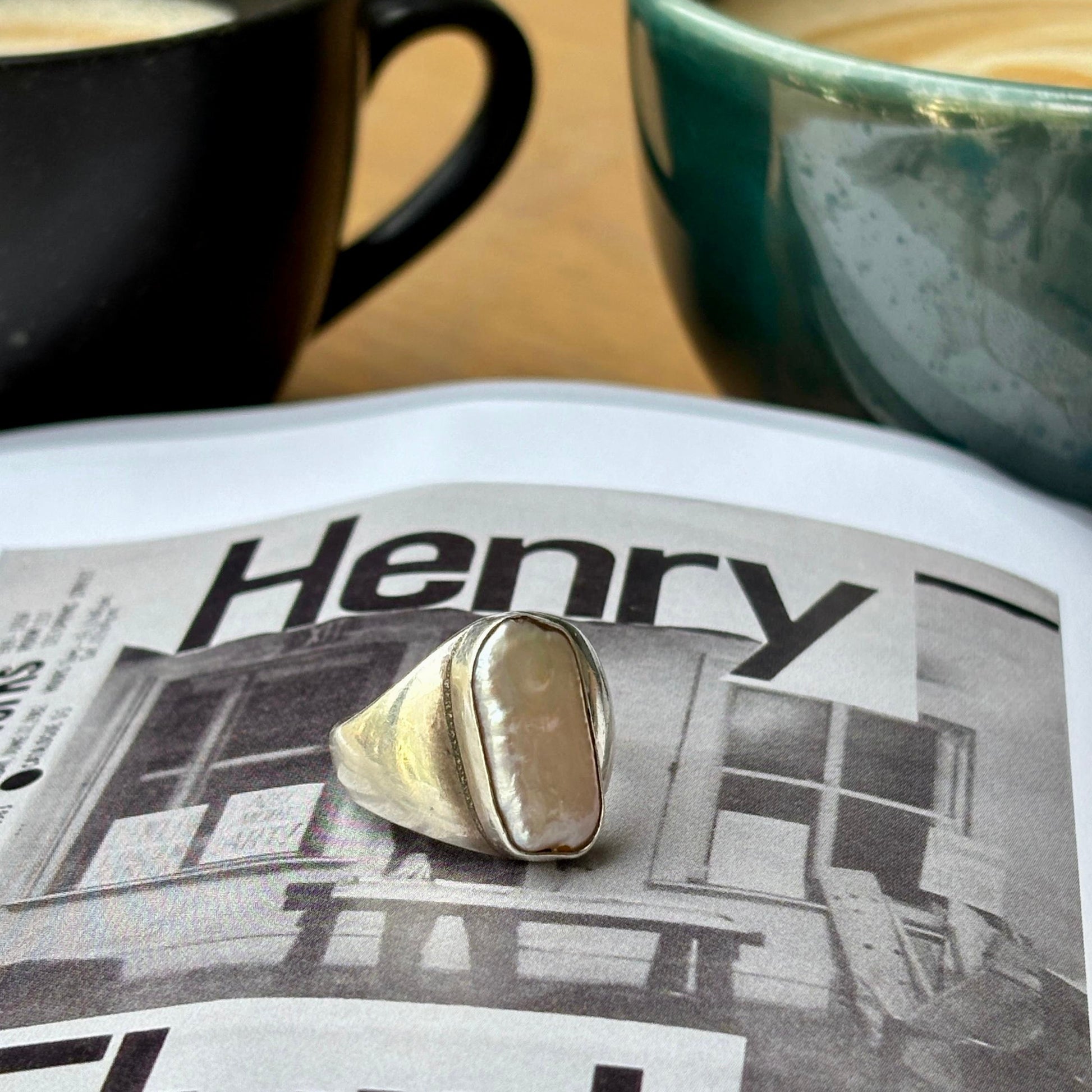 טבעת כסף בעבודת יד, המשובצת בפנינה טבעית גדולה וייחודית. כל פנינה נושאת צורה, גוון וטקסטורה מעט שונים, מה שהופך כל טבעת ליצירת אומנות אחת ויחידה.