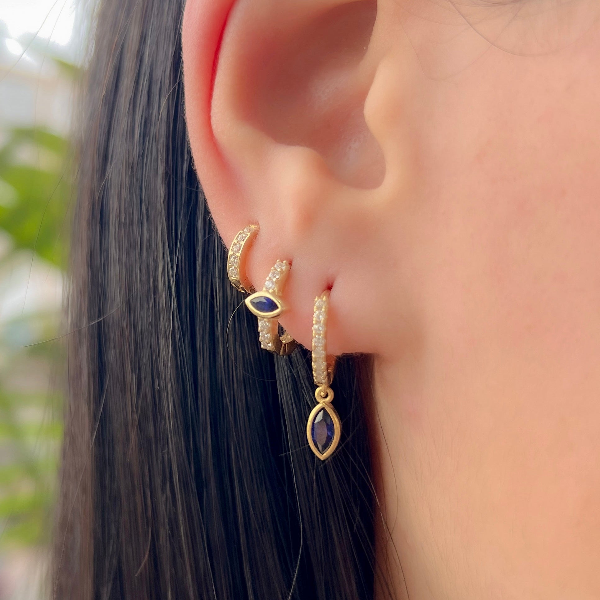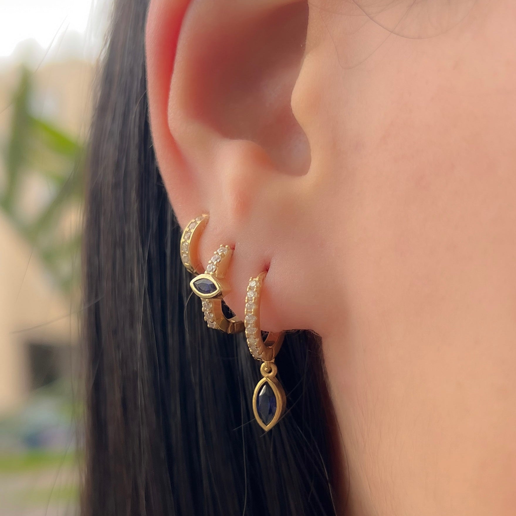 זוג עגילי חישוק קלאסים עדינים ומשובצים עם תליון כחול נופל.