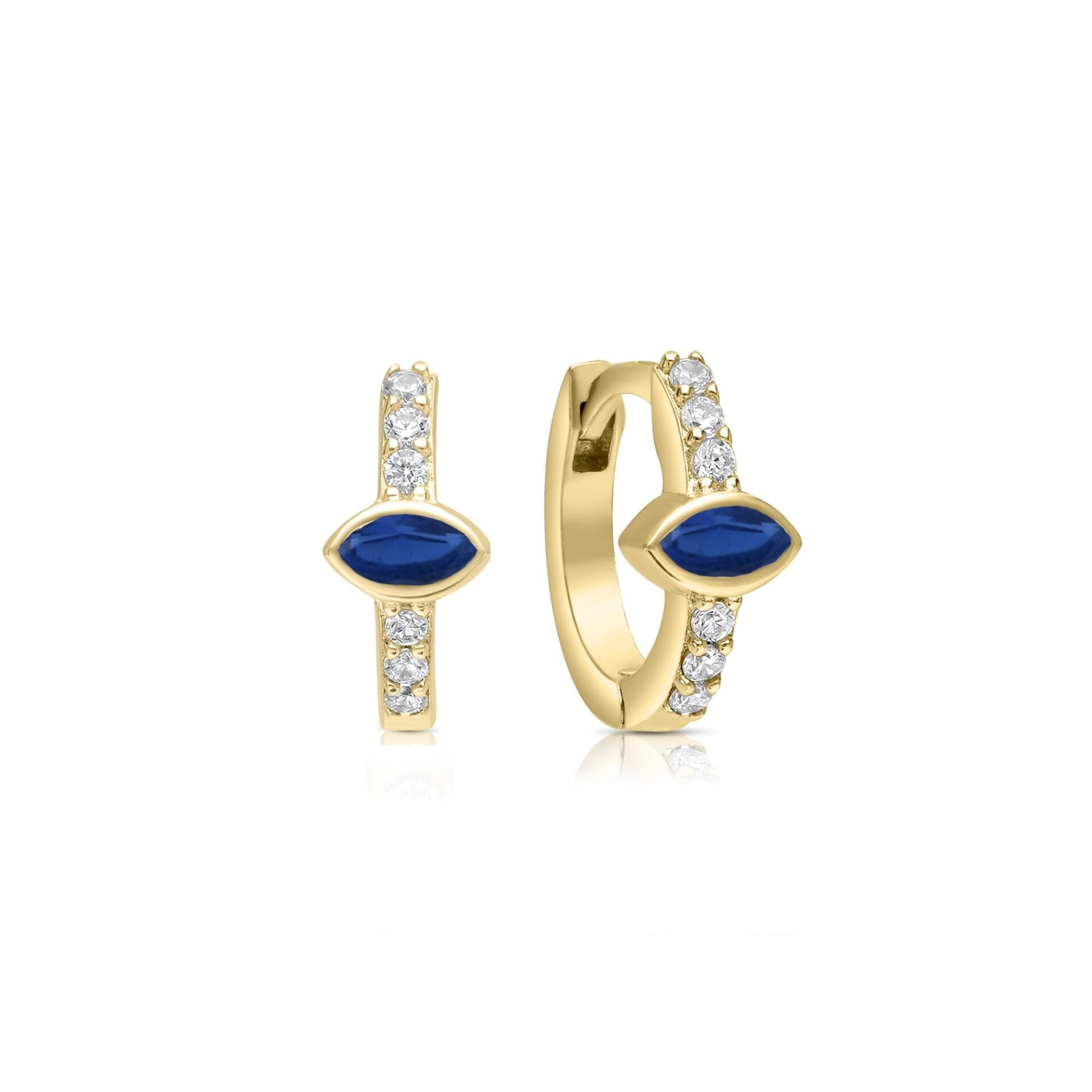 זוג עגילי (לילי) חישוקים עדינים עם שיבוץ לבן ובאמצע אבן זרקון בחיתוך מרקיזה כחולה.